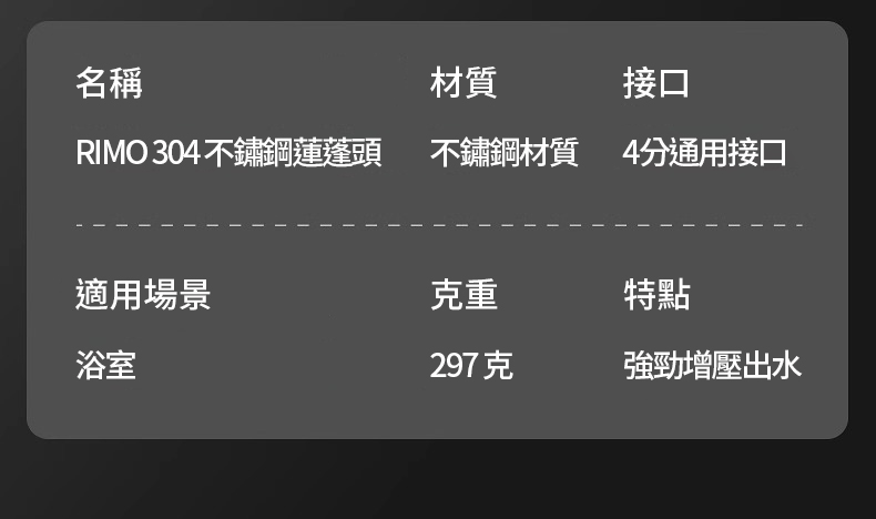 2分鐘前RIMO 304不鏽鋼增壓蓮蓬頭 - RIMO 304不鏽鋼增壓蓮蓬頭(免運二入組)NT$1699