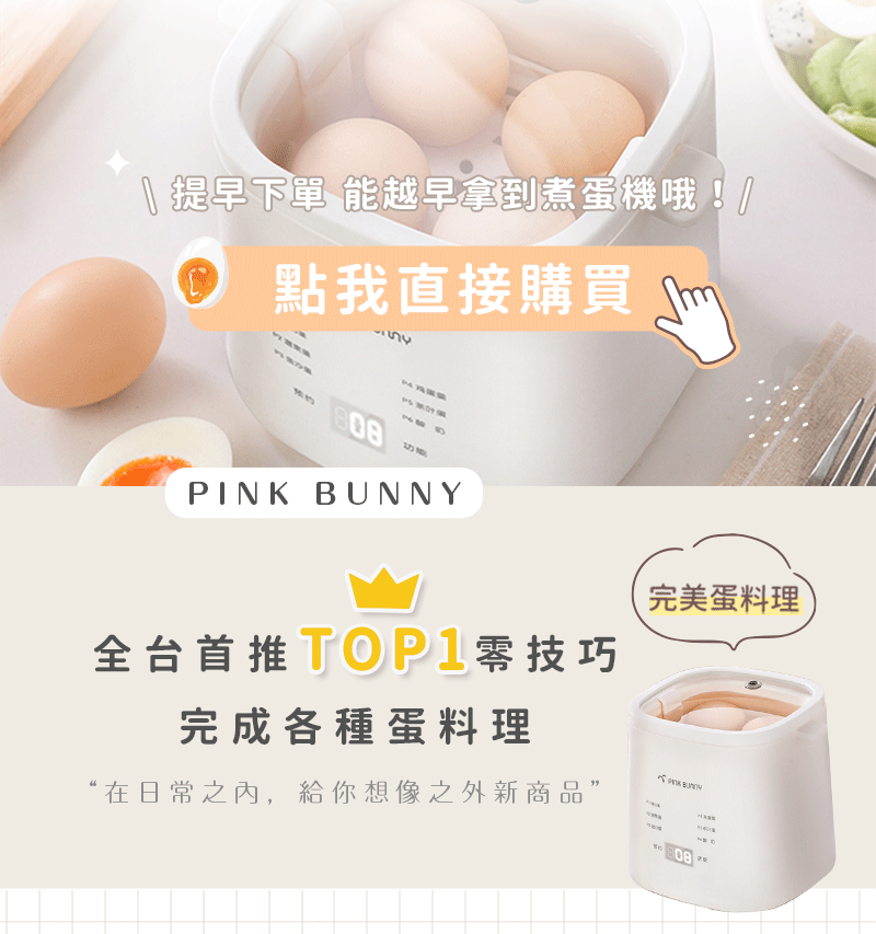 25分鐘前Pink Bunny智能煮蛋機智能控溫烹煮,營養美味輕鬆上桌 - Pink Bunny智能煮蛋機2入組 NT$1990